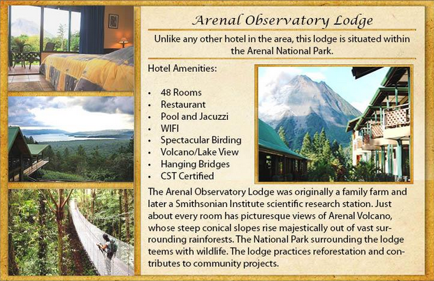 We'll next travel to the Arenal Volcano area, making a stop at the Danaus Ecological Center. This is an area of 3 hectares in natural regeneration accessible trails. Walking these trails enables the visitor to appreciate the diversity of wildlife and tropical plants native from the area, including heliconia, orchids and palms. During the tour we'll hopefully see both the two-and three toed sloth, large numbers of birds (more than 150 different species), basilisks, iguanas, insects, poison dart frogs, etc.