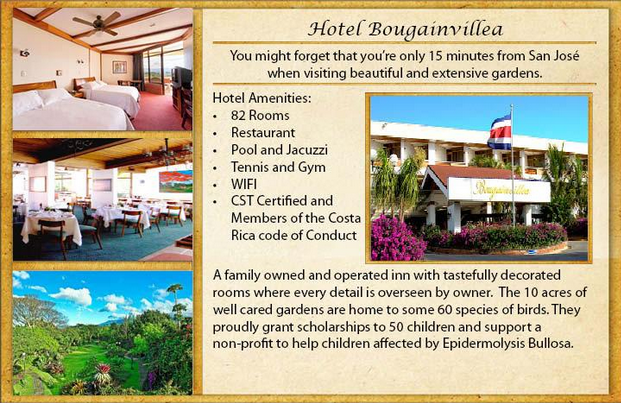 One of our transport representatives will drive you from the Hotel Bougainvillea to the International Juan Santamaria Airport, where you must check in approximately 3 hours prior to the time of your scheduled flight.